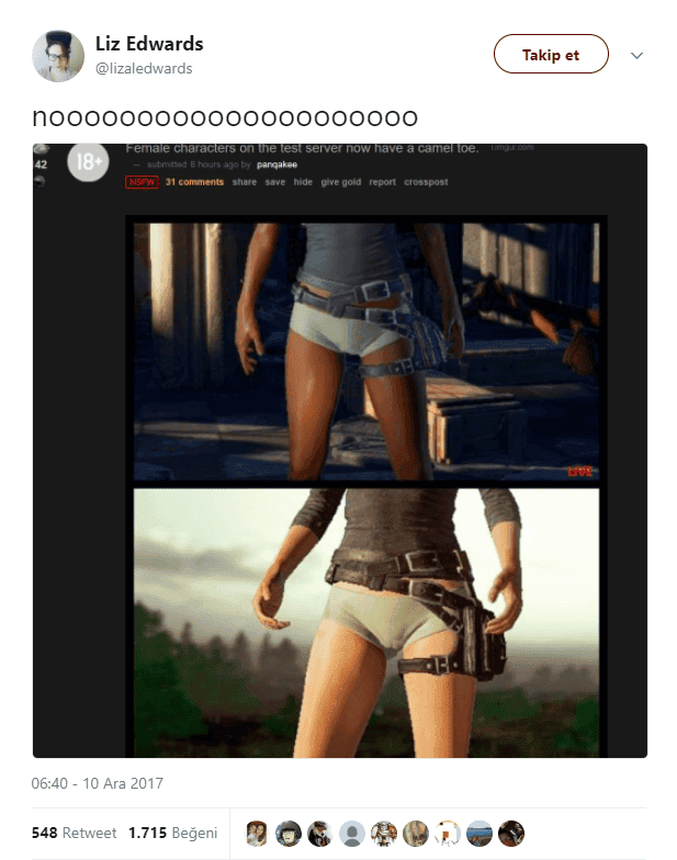 PUBG ekibi bu durumun kısa süre içerisinde düzeltileceğini belirterek, tüm oyunculardan özür diledi. Böyle bir durumun olması tabii ki doğru değil. Sonuçta cinsel organı belli olan karakter bir oyun da olsa, insanları yanlış şekilde yönlendirebilir. Zira