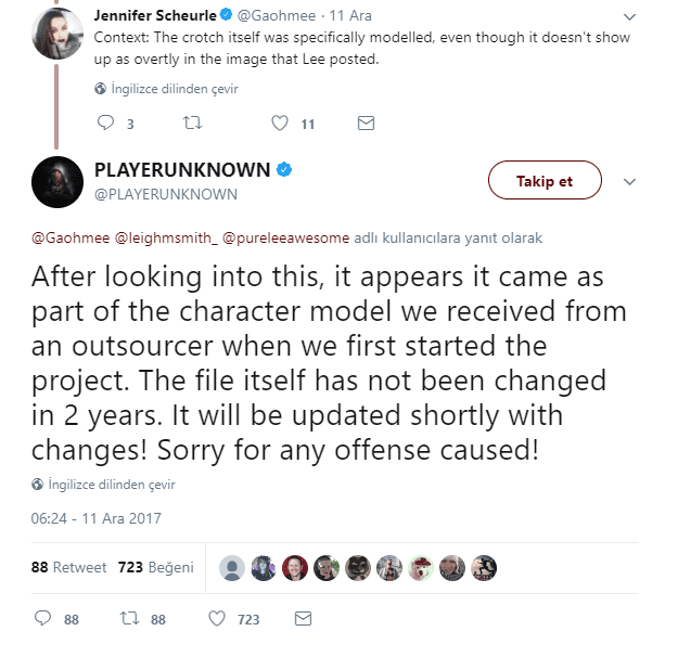PUBG de açıklama yapmak durumunda kaldı ve şunları söyledi: "Kadın karakter üzerinde görülen o kısım, oyunun ilk çıkış yaptığı zamanlarında geliştirici ekipten olan bir kişi tarafından tasarlanmıştı. Şuanda o geliştirici ekipte olmadığı gibi, karakter dosyasına da 2 senedir dokunulmadı. Yani oyunun geliştiricileri bu durumu kasıtlı olarak değiştirmedi ve yayınlamadı." dedi.