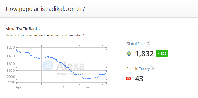 Radikal.com.tr aşağıdaki Alexa verilerine göre dünyada 1.832, Türkiye'de 43. sırada olduğu görülmektedir. Türkiye'deki milyonlarca web sitesinden sıyrılıp, bu şekilde otoriter bir yapıda bulunmak her yiğidin yiyeceği bir harç değildir. (Webmaster anlamında)