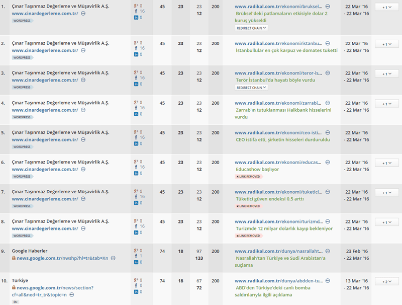 Bu tabloda sadece ilk 10 adet referans backlinkleri görüyorsunuz. Kimi web siteleri radikal.com.tr'deki haberleri bot ile çekerek referans olurken, kimi web siteleri de manuel link eklemeleri yaparak kaynak gösterebiliyor. Ayrıca Radikal, Google News kayıtlı olduğu için, Google haberler servisinden de ziyaretçi çekmektedir. Bu kısma da birazdan geleceğiz.