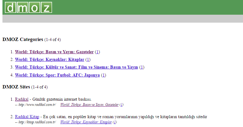 Dmoz Kavramı: The open Directory Project olarak tanıdığımız Dmoz.org sitesi dünyada ve Türkiye'deki web sitelerini belirli kriterlere göre değerlendirerek ilgili kategorilerde yayınlanyan dizin sitesidir. Dmoz arama motorları gözünde değerli bir yapıda olduğu için, buradan alacağınız referans bir backlink sitenizin autory değerini arttırmasına yardımcı olacaktır. Radikal web sitesi de Dmoz üzerinde World: Türkçe: Basın ve Yayın: Gazeteler kategorisinde yer almaktadır.