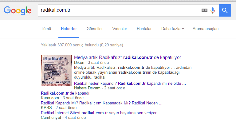 Radikal web adresi kapandığında Google news gibi değerli bir servisten de muaf kalarak silinecek. Şuana kadar "Radikal" kelimesinde Google News servisinde 397 bin adet içerik yer alıyor.