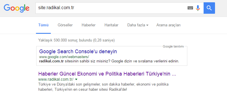 İpucu: Bir web sitesinin Google arama motorunda ne kadar makalesinin veya linkinin indeks aldığını görebilmek için site:siteadi.com olarak aratmanız yeterlidir.