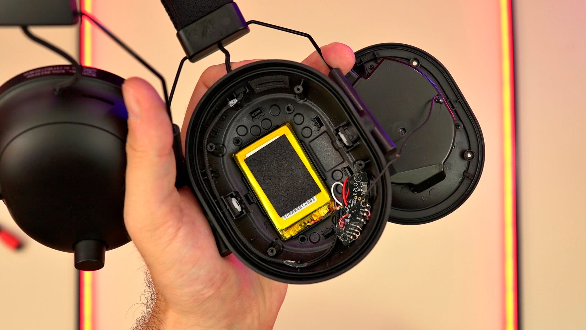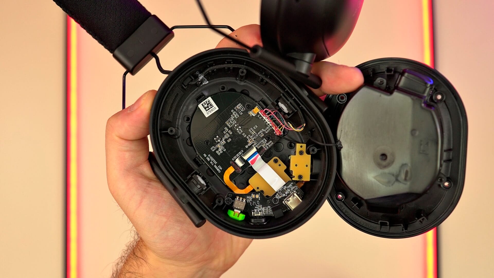 Burada bir tarafta devre kartı ve kontroller için butonların bağlantıları yer alırken, diğer tarafta ise pilin konumlandırıldığını görüyoruz. Her iki kulaklık başının da iç kısmında düzenli bir yerleşim olduğunu söylemek lazım. Bu açıdan bakacak olursak iç tasarımın başarılı ve düzenli olduğunu söyleyebiliriz.
