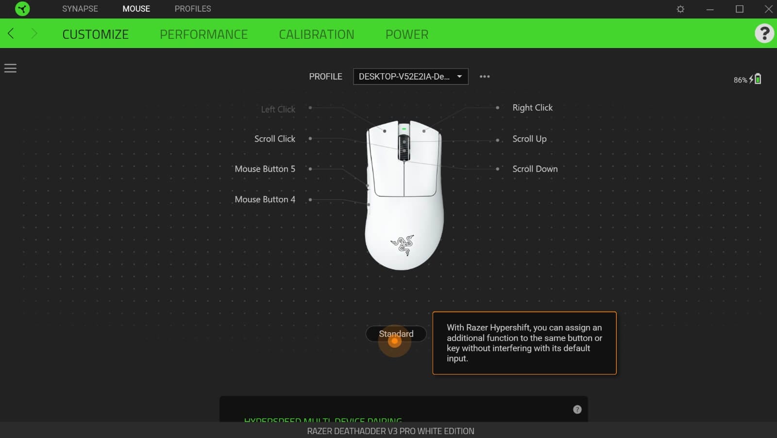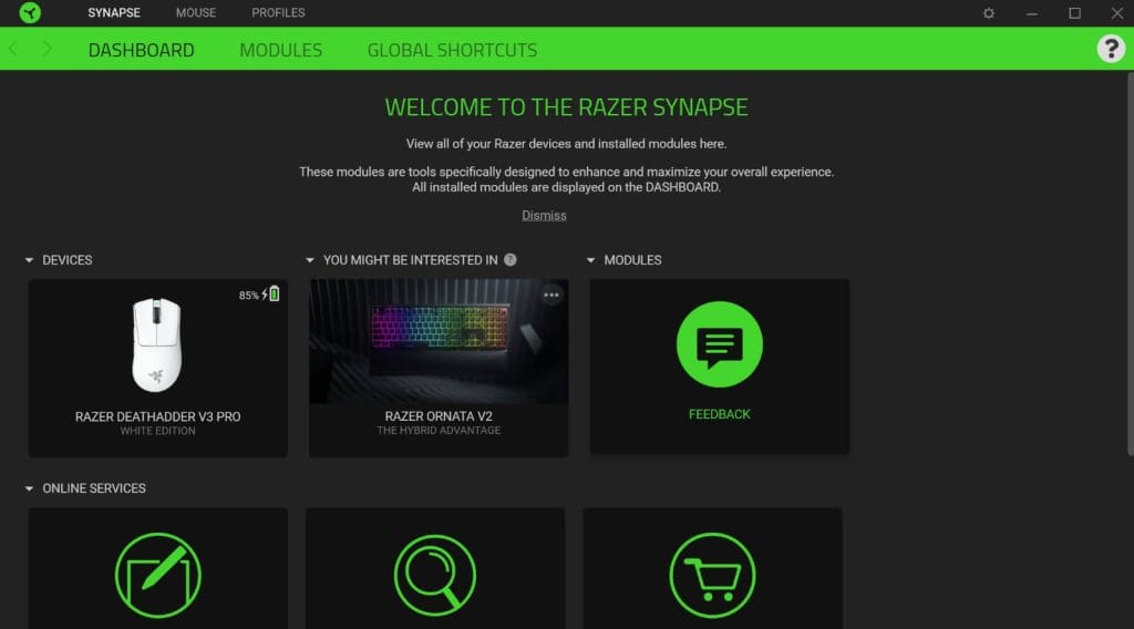 Oyuncu mouse, Razer Synapse yazılımıyla beraber kullanılabiliyor. Basit bir arayüze sahip olan yazılımı kurduğunuz zaman direkt olarak cihazınız gözüküyor. Burada cihazının pil durumunu da görebiliyorsunuz.