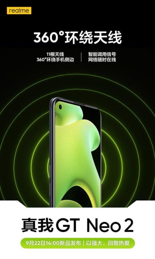 Weibo üzerinde paylaşılan postere göre cihaz, daha iyi hücresel bağlantısı sunmak için kasanın etrafına yerleştirilmiş 11 antene sahip olacak, dolayısıyla 360 derecelik anten teknolojisine sahip olacak. Realme GT 5G modelinin farklı bir varyantı olan Realme GT Neo2, 22 Eylül'de tanıtılıyor olacak, bu yüzden lansman tarihine üç gün kala tüm sızıntıların artık internete düşmesi an meselesi.