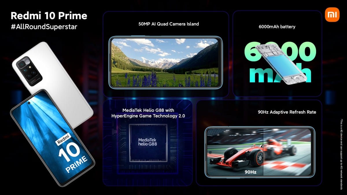 Redmi 10 Prime, ekran tarafında 90 Hz yenileme hızına sahip FHD+ çözünürlüğünde 6,5 inçlik LCD panele sahip. Arka tarafta bulunan kamera kümesinde 8 MP ultra geniş açılı kamera f/1.8 diyaframına sahip 50 MP'lik ana kamera ve makro çekimler ve derinlik algılama için iki adet 2 MP lensi bulunuyor. MediaTek Helio G88 işlemci, 4GB/6GB RAM varyantları ve 64GB/128GB depolama alanı ile birlikte satışa çıkıyor.