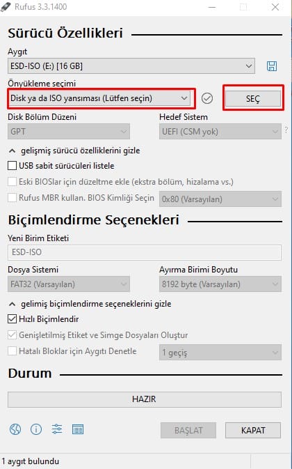 2 Yöntem : Rufus Programı İle BOOT Usb Oluşturma