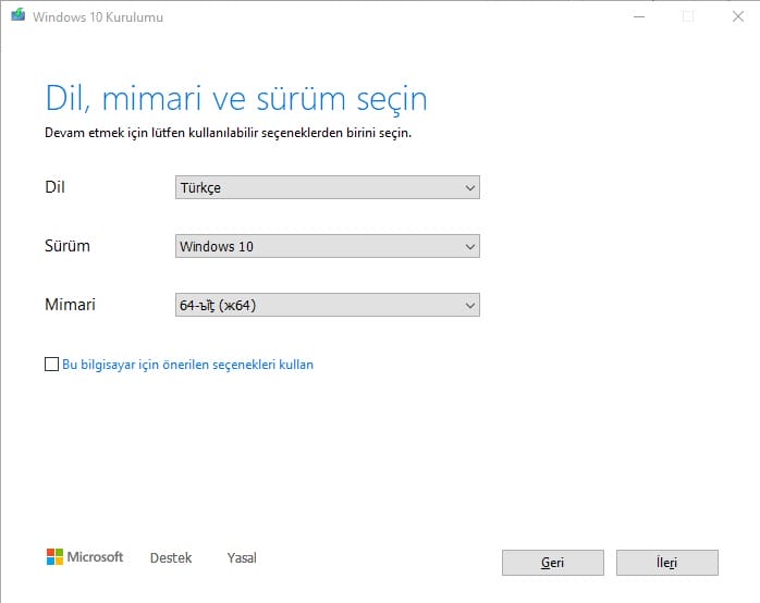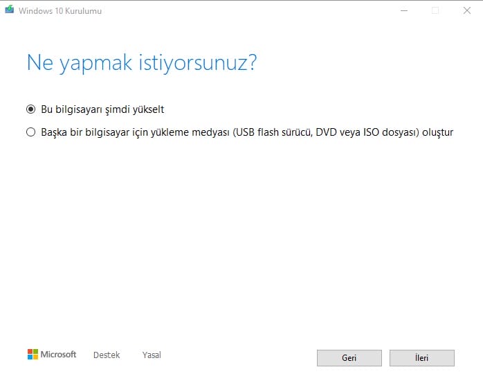 Microsoft tarafından desteklenen ve önerilen yöntemdir. Bu indirme aracı sayesinde bilgisayarınıza veya direk USB belleğinize Windows'u indirebilirsiniz.