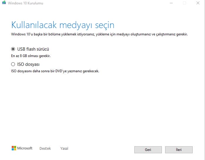 Microsoft tarafından desteklenen ve önerilen yöntemdir. Bu indirme aracı sayesinde bilgisayarınıza veya direk USB belleğinize Windows'u indirebilirsiniz.