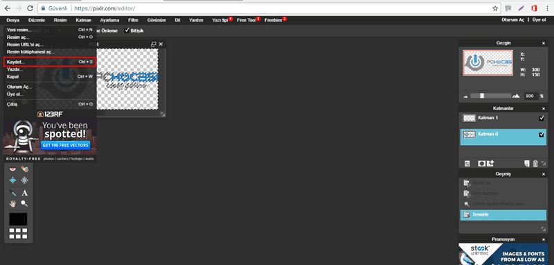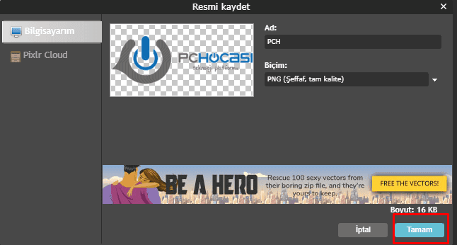 10-PNG(Şeffaf, tam kalite) seçili olacak şekilde resminizi kaydedin.