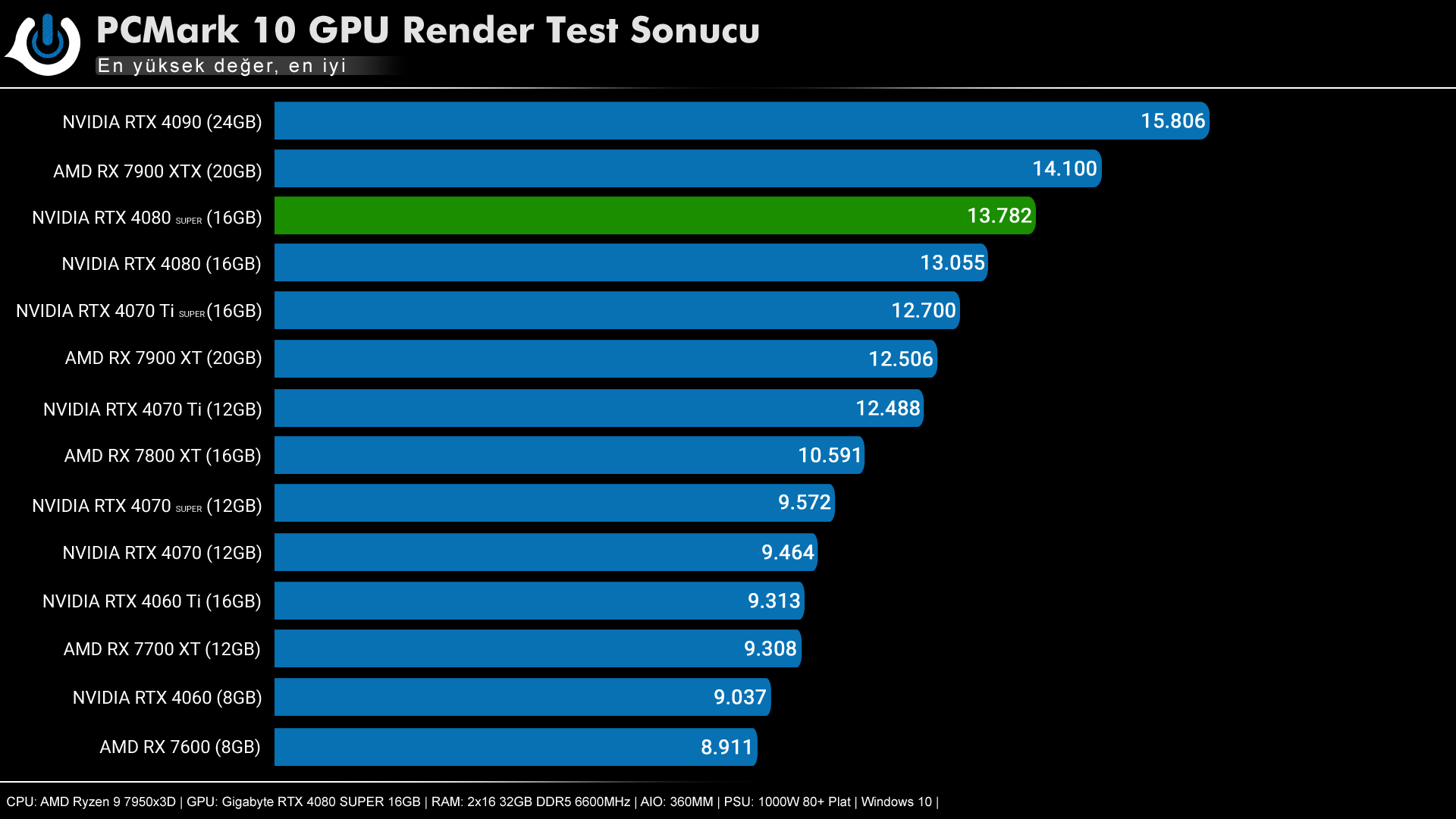 13.782 skorunu alıyor. RTX 4080 modeliyle aradaki fark biraz daha artıyor. Ama yine arada uçurum olmadığının altını çizmiş olalım. Ayrı testlerde RTX 4080 modelinin elde etmiş olduğu