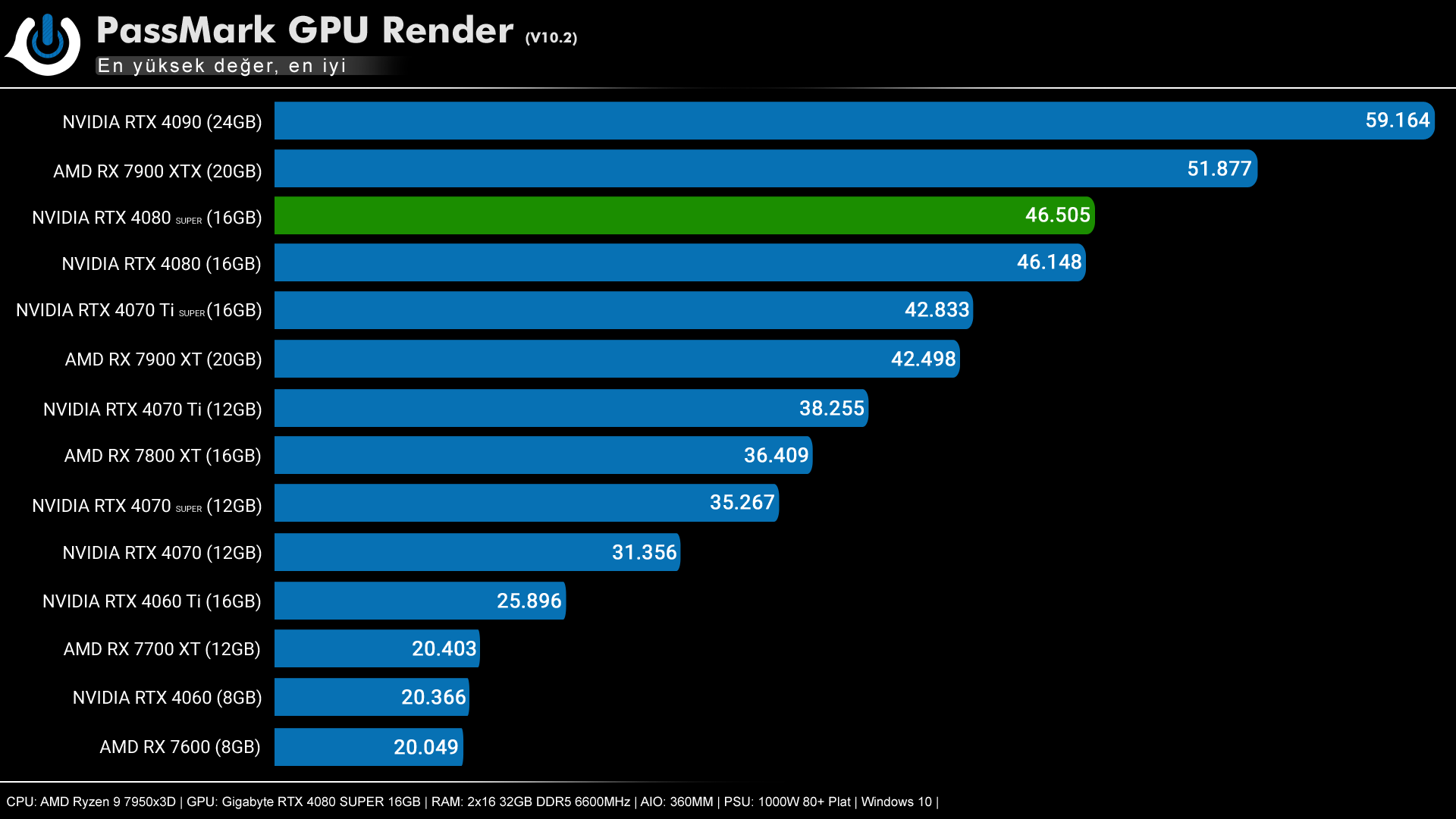 Gelelim yeni ekran kartları için PassMark sonuçlarına. Burada da yeni ekran kartının AMD RX 7900 XTX modelinin hemen gerisinde konumlandırıldığını görüyoruz. AMD RX 7900 XTX modeli aynı testlerde