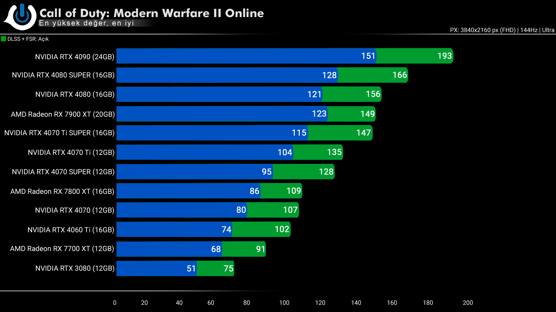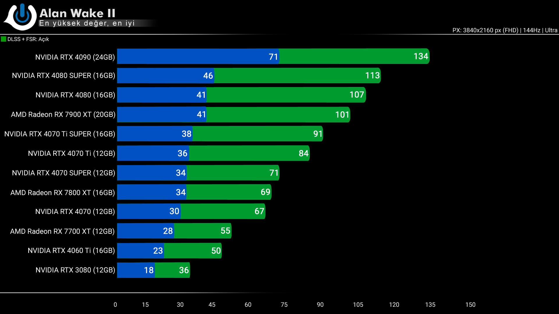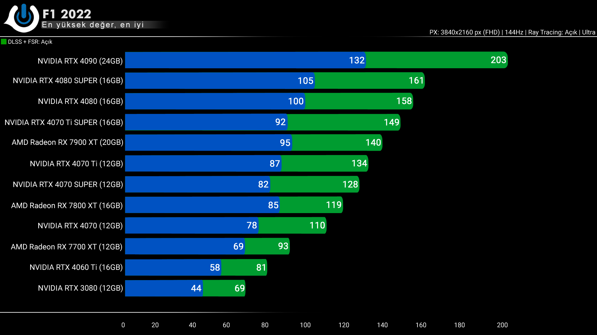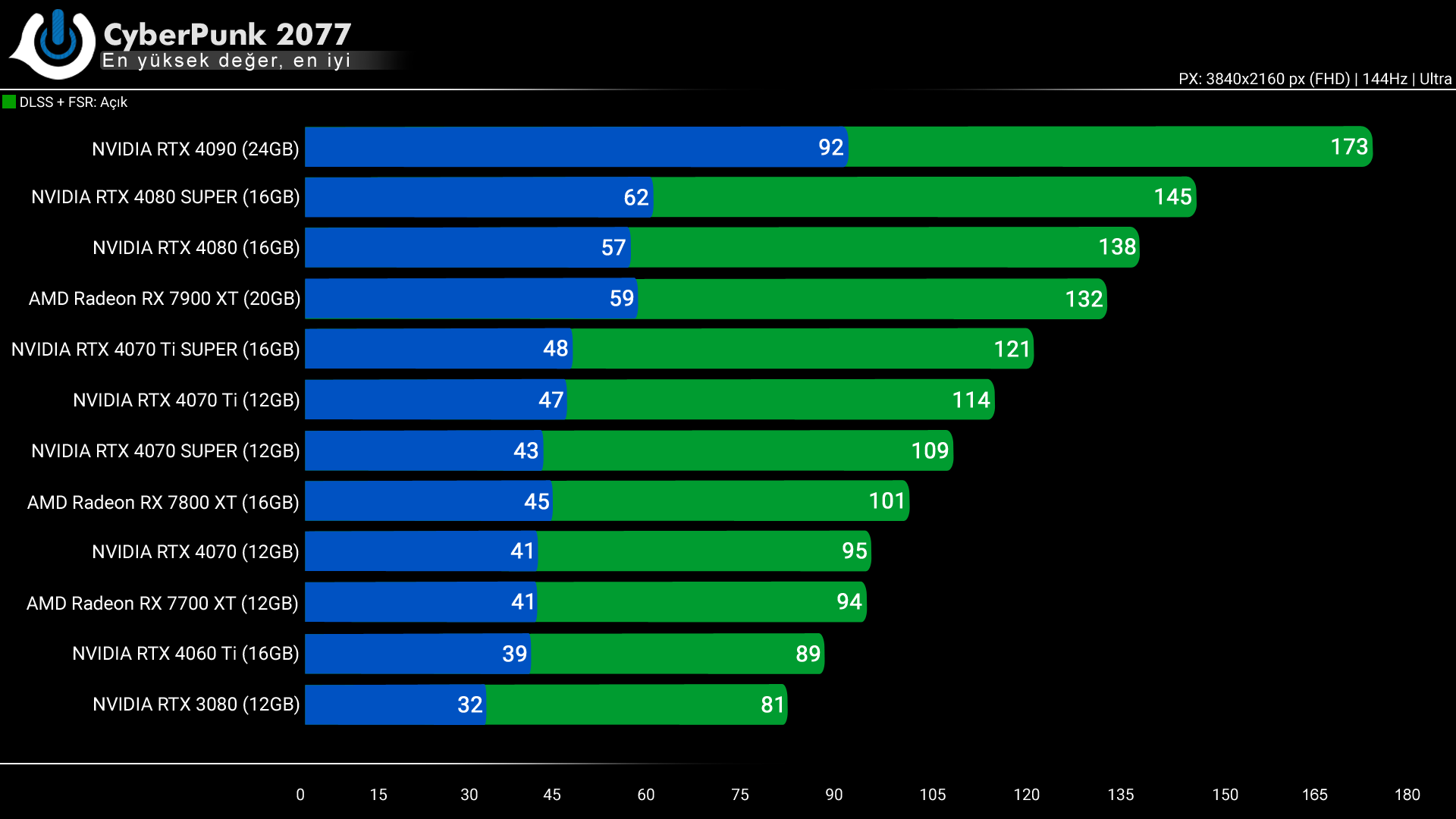 DLSS değerlendirmesine baktığımız zaman, RTX 4080 SUPER modelinin RTX 4080 modelinin hemen üzerinde yer aldığını görüyoruz.