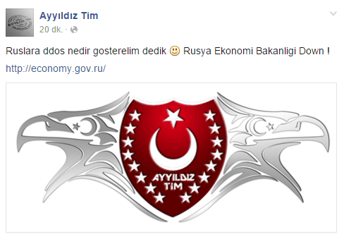 Son zamanlarda hacker grubu anonymous Türkiye’de özellikle devlet siteleri ve bankaların sistemlerine DDOS saldırıları ile saldırılarda bulunmasına karşılık Türk hacker grubu Ayyıldız tim Rusya Ekonomi Bakanligi sitesini aynı saldırı şekli ile kullanılamaz hale getirdi.