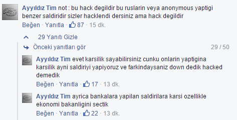 Facebook sayfasından yapılan açıklamaya göre misillemelerin devam edeceğini ve daha kalıcı hasarlar verileceğini belirten Ayyıldız tim sosyal medya üzerinden bir çok kişi tarafından destek mesajları ile desteklendi.
