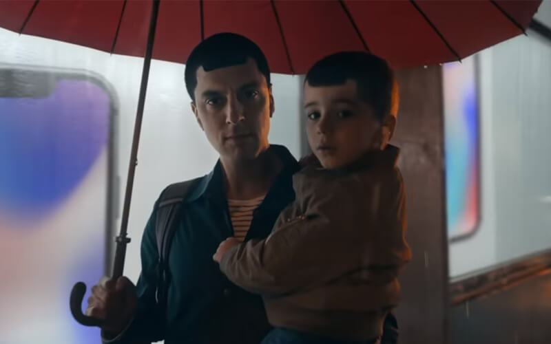 İşte burdan sonra herkesin ilk izleyişte farkedemediği bir kısım var. Servis sahnesinden sonra kadın dışarda yürürken yanlarından şemsiye altında yürüyen bir baba ve oğlu geçiyor. Baba ve oğulun saç kesimine baktığımızda iPhone X'in çentikli ekranına benzeyen saçları olduğunu fark edebilirsiniz.