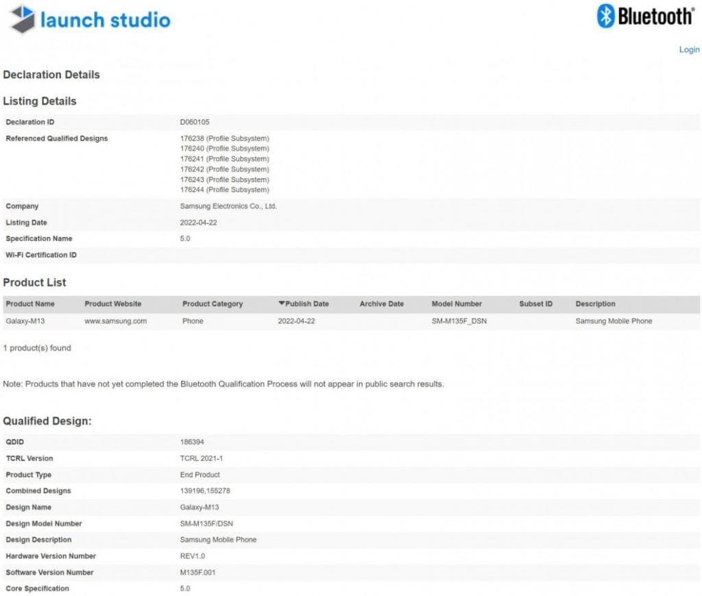 Güney Kore merkezli akıllı telefon ve teknoloji devlerinden Samsung, bu yıl Şubat ayında Galaxy M12 modelini resmi olarak tanıttı ve bugün internete düşen bir takım raporlara göre akıllı telefonun yeni bir modeli olan Galaxy M13 lansman için hazırlanıyor. Çok yakın bir zaman dilimi içerisinde piyasaya sürülmesini beklediğimiz akıllı telefon Bluetooth sertifikasını almayı başardı.