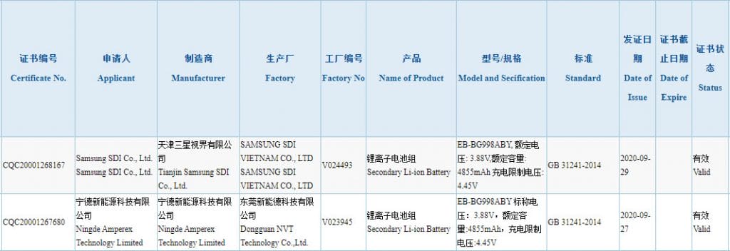 Şimdi ise, EB-BG998ABY ile aynı model numarasına sahip pil, 3C sertifikasyon sitesinde göründü ve bu bize pilin S21 Ultra'da yer edineceğini söylüyor. Sertifika belgesi, pilin 4855 mAh nominal kapasiteye sahip olacağını ortaya koyuyor, bu da büyük olasılıkla gerçek kapasitenin 5000 mAh olacağı anlamına geliyor. Bu, birkaç gün önce internete sızan bilgi ile aynı doğrultuda.
