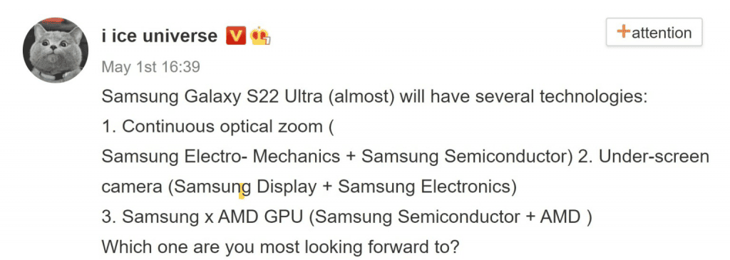 Ice Universe'e göre Samsung Galaxy S22 modeli, sabit yakınlaştırma seviyelerine (2x, 10x) kıyasla sürekli yakınlaştırma özelliğine sahip olacak. Şu anda orta yakınlaştırma seviyelerine ulaşmak için telefonunuz dijital olarak enterpolasyon tekniğini uygulayarak kalite kaybına neden olurken, sürekli yakınlaştırma her zaman pikselin mükemmel olmasını sağlayacak.