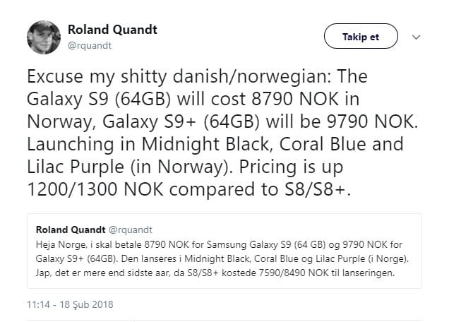 WinFuture sitesinden Roland Quandt'ın Twitter üzerinden paylaştığı gönderi ile yeni amiral gemisi modellerinin fiyatları belirlendi. Habere göre Samsung'un yeni amiral gemisi S9 1.123$ (4.245 TL), üst versiyonu S9 Plus ise 1.251$ (4.749 TL) fiyat etiketine sahip olacak.