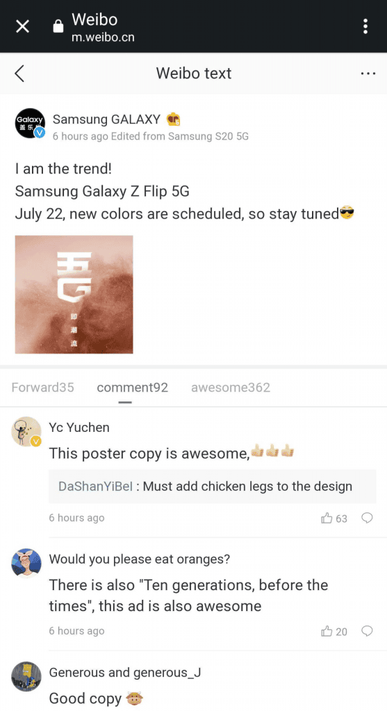 Weibo'da paylaşılan gönderide ayrıca Galaxy Z Flip 5G'nin yeni renk seçenekleri ile geleceği de söyleniliyor.