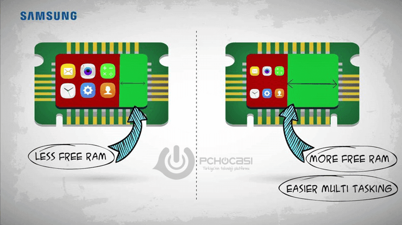 Geliştirme aşamasında Samsung ilk olarak Android arayüzünde geliştirmeler yaparak yukarıdan aşağıya doğru listeleme yaptı ve ardından varsayılan uygulamaları da küçülterek fazladan yer açtı. Akıllı bellek teknolojisi devreye girdiği andan itibaren cihazın belleğinin yetmediği durumlarda şişme yapmaması için pek çok uygulamayı direkt Kernel üzerinden kapatarak sistemi rahatlatıyor. Aynı zamanda pek çok uygulama arka planda çalıştığı için şişmeler meydana gelirken, bu teknoloji sayesinde otomatik olarak arka plan uygulamaları da kalmayacak. Bu sayede hem işlemci hem de RAM fazladan yer kazanarak rahatlamış olacak.