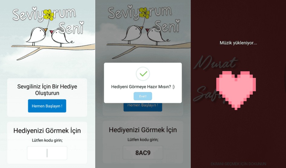 Uygulamayı kullanırken basit bir kaç adım ile oluşturmuş olduğunuz slaytlarınıza istediğiniz sözcüğü ekleyebiliyor, ardından sevdiğiniz ile çektirmiş olduğunuz resimler ile de süslediğiniz taktirde ortaya güzel görüntüler çıkıyor. Hediye oluşturma ekranına gelerek de size verilen kodu başlangıç ekranına girdiğiniz taktirde sevgilinize yapmış olduğunuz sürprizi görerek izlemeye başlıyor. Hasan kardeşimize bu güzel uygulaması için teşekkür ediyoruz.