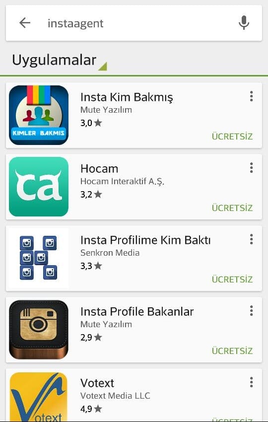 Aşağıdaki resimde de görmüş olduğunuz üzere InstaAgent uygulaması Google Play Store'da bulunmuyor. Ancak aşağıda bulunan uygulamaların da aynı şekilde zararlı olabileceğinin altını çizelim. Genellikle third-party olan bu uygulamalar kişilerden "yükle" butonuna basıldığında "Bu uygulama aşağıdaki izinleri istiyor" şeklinde yönlendirme yapmaktadır.