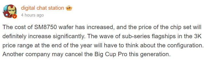 SM8750 wafer maliyeti arttı ve çip setinin fiyatı kesinlikle önemli ölçüde artacak. Yıl sonunda 3K fiyat aralığındaki alt seri amiral gemileri, konfigürasyonlarını yeniden düşünmek zorunda kalacak. Başka bir şirket, bu nesilde Big Cup Pro'yu iptal edebilir.[/caption]