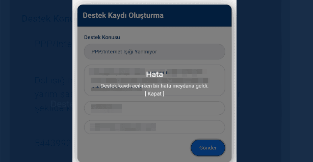destek talebi oluşturulmaya çalışıldığında, sistemin "hata" uyarısıyla karşılaşıyorsunuz. Daha önceden de belirttiğimiz gibi TurkNet'in resmi