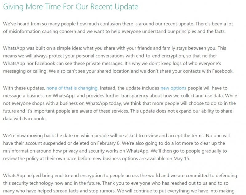 Yapılan son dakika açıklamasına göre yeni gizlilik sözleşmesi ertelendi. Resmi blog üzerinden açıklama yapan yetkililer, alınan güncelleme kararının kafa karışıklığına neden olduğunu ve birçok kullanıcıyı endişelendirdiğini belirtti.