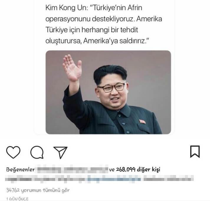 Ardından Instagram sayfasını zamanında kasan ve kendini bilmeyen bir kaç sayfa sahibi 'Kim Jong Un Afrin Operasyonunu Destekliyor','Kraaaaaal','Adammmmm beee','Yerim seni tombişşşş' gibi pek çok postlar paylaşıldı. Sonra bu postların altında yer alan yorumlara bakıldığında ise ikinci şoku yaşamış oluyorsunuz.