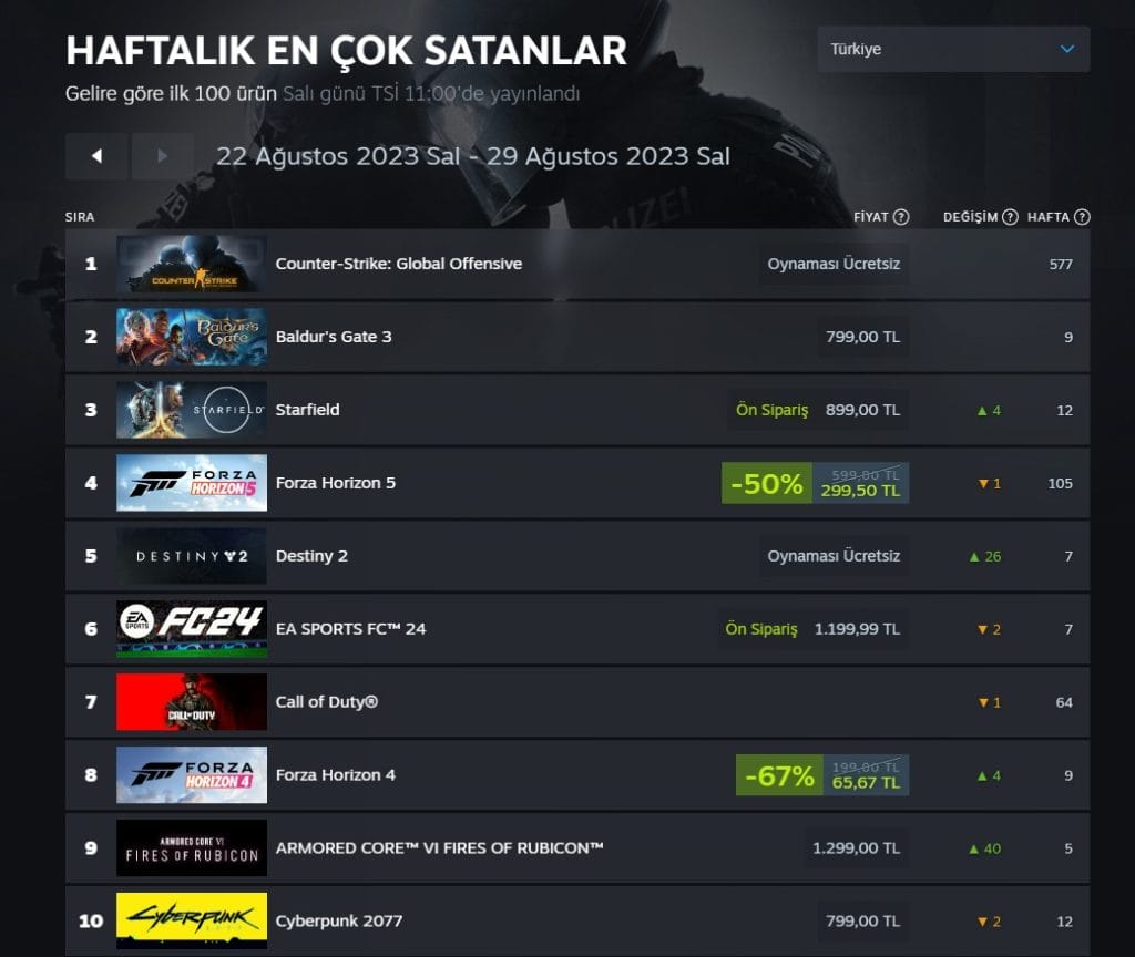 Bu hafta en çok satanlar listesine damga vuran yeni bir yapım var. The Forest oyununun devamı olan Sons Of The Forest yapımından söz ediyorum. Yapım, 280 TL fiyatla satışa sunuldu ve görünen o ki ülkemizde de çok dikkat çekmeyi başardı. Yine listenin devamında da genel olarak yeni oyunların hakim olduğunu görüyoruz. Aşağı sıralama için bir tablo eklemesi yapalım.