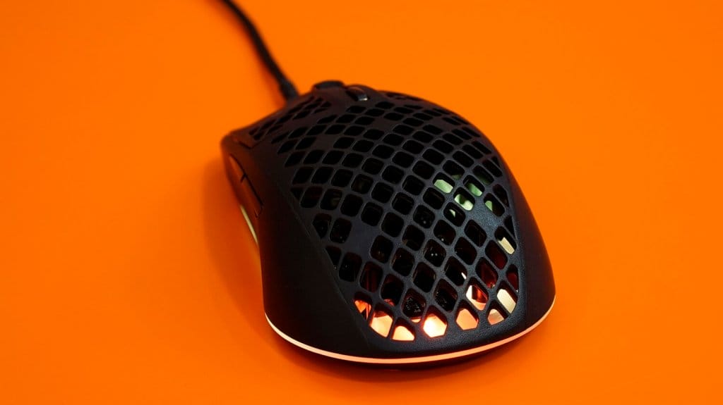SteelSeries Aerox 3'ün her tarafı RGB aydınlatmalarla donatılmış, zaten delikli bir yapıya sahip olduğu için alt tabanda bulunan aydınlatmalar üst tarafa da kolaylıkla yansıyor.