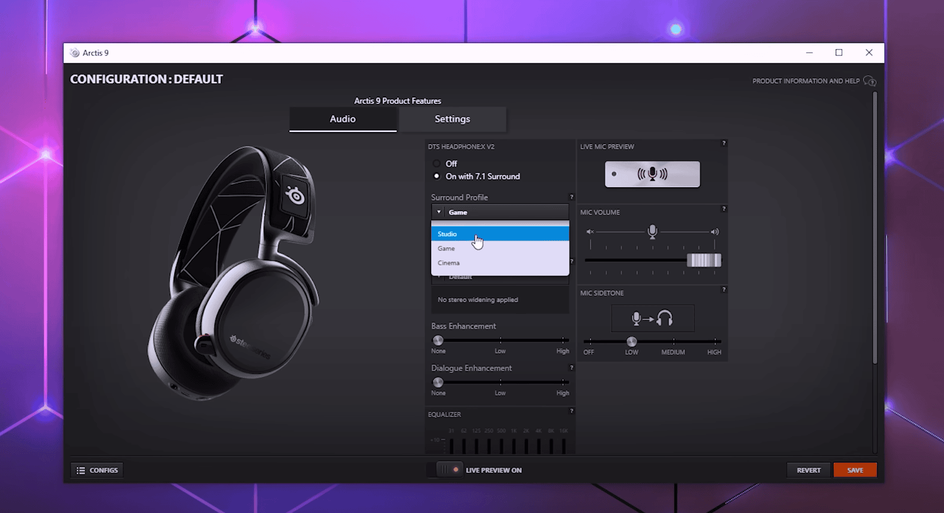7.1 sanal ses desteğini tek başına bırakmayan SteelSeries, deneyimi daha ileri seviyeye taşımak amacı ile DTS: Headphone X 2.0 motorunu kullanıyor. Bu motor sayesinde ses ayrıştırmasını çok daha detaylı hale getiren kulaklık, sanal ile gerçek 7.1 arasında fark edilebilir bir çevresel ses deneyimi sunuyor. Üstelik film, müzik ya da oyun gibi farklı kullanım senaryolarına uygun profilleri de seçebilmek mümkün. Bu özellik, yazılım tarafından etkinleştirilip devre dışı bırakılabiliyor.