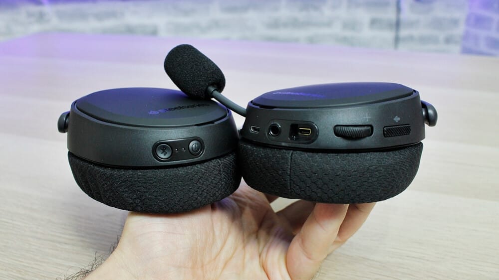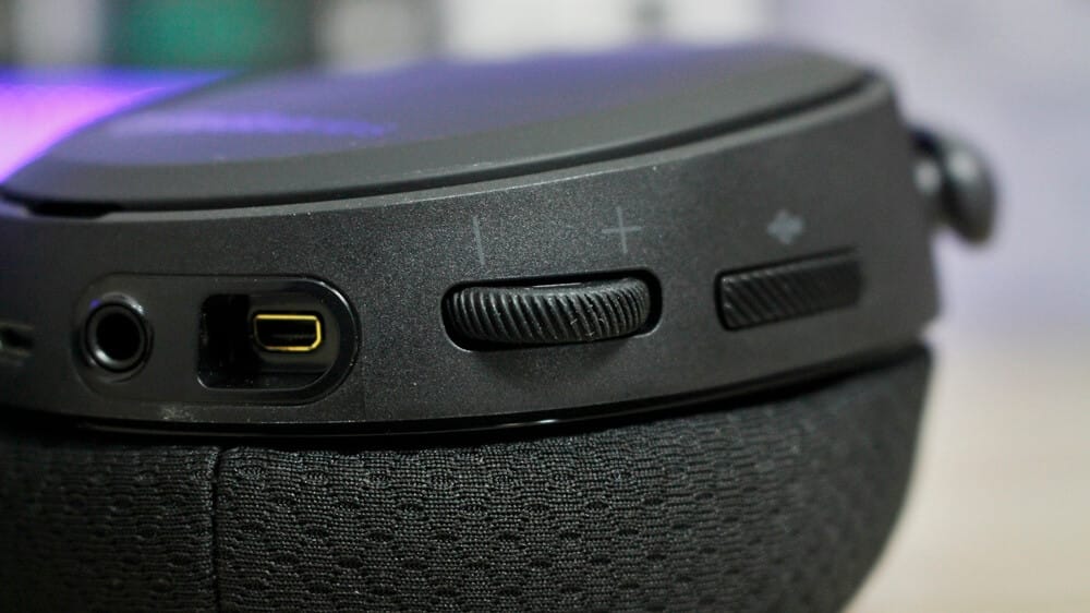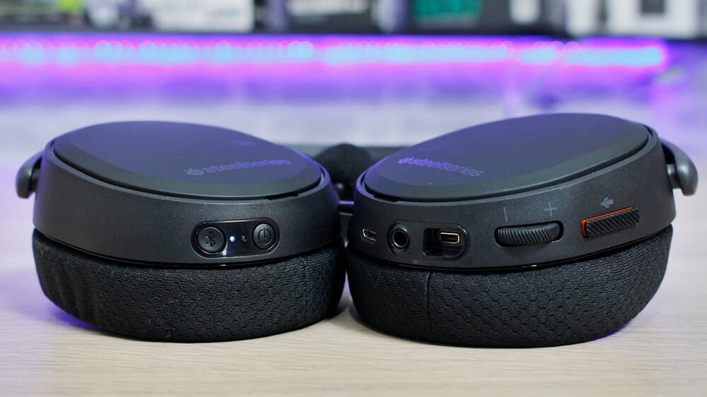 Arctis Pro'nun üzerinde bulunan tuşlara da değinecek olursak kullanım türüne göre ayrılmış 3 adet tuş görüyoruz. Bu tuşlar; güç tuşu, Bluetooth tuşu ve mikrofon tuşu. Mikrofon tuşu mikrofonu çalıştırmak için kullanılıyor ve kapattığınızda mikrofon üzerinde bulunan LED kırmızı renge bürünüyor. Bu rengi sizler değiştirebiliyorsunuz. Yine kulaklık üzerinde ses açıp kısmaya yarayan bir tekerlek de bulunuyor.