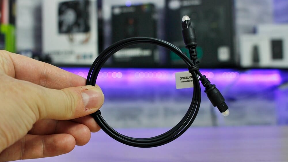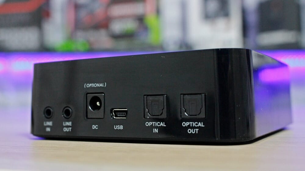 Kulaklık kısmını bitirdikten sonra diğer parçamız olan transmitterdan da bahsedelim. Yine siyah bir yapıda gördüğümüz bu verici, esasen kulaklık ile bilgisayar arasındaki iletişimi sağlıyor diyebiliriz. Transmitterın arka kısmına baktığımzda da 3.5mm jack giriş ve çıkışı, güç girişi, optik giriş ve çıkış ile birlikte mini-USB yuvası görüyoruz.