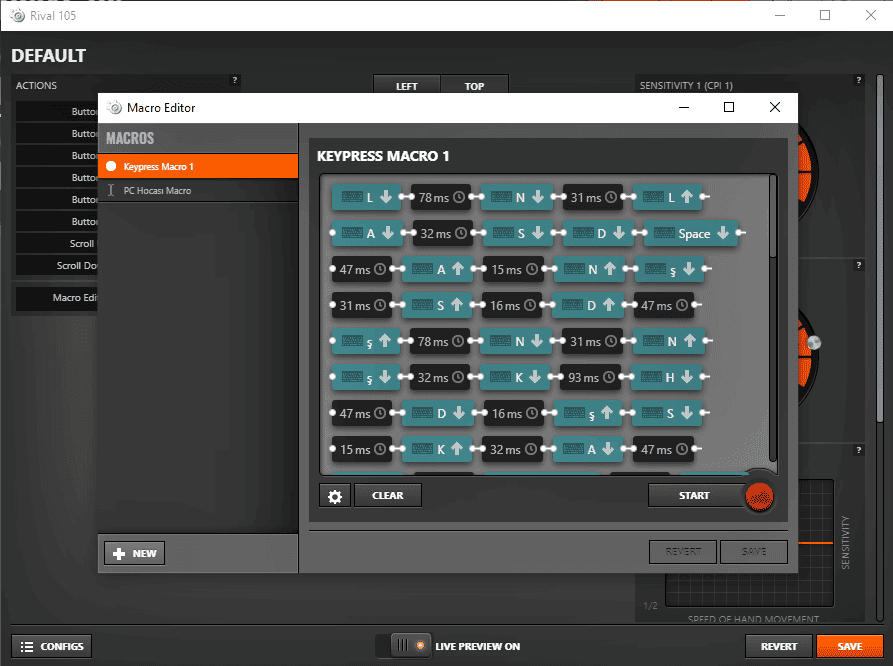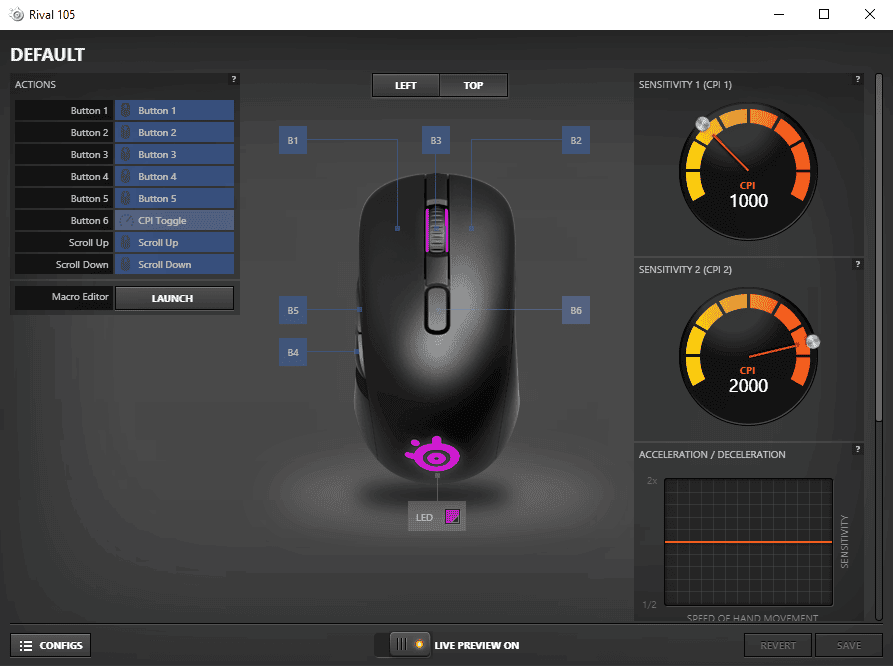 Öte yandan Rival 105, makro atamalarına da destek sunuyor. Bunun için SteelSeries'in Engine 3 yazılımını indirmeniz gerekiyor. Yazılım; hem makro atamaları, hem RGB aydınlatma özelleştirmeleri hem de DPI, IPS ve ivmeleme gibi ayarlamalara olanak tanıyor.