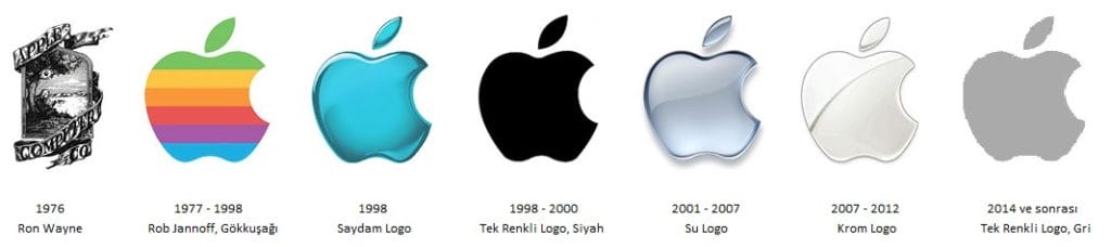 Şirket bu zamana kadar logosunda 7 kere değişikliğe gitmiş ve renkli renki logolar kullanmış. Apple'ın renkli logosu 1977 - 1998 yılları arasında tam 21 yıl kullanılmış. Yani Steve Jobs'ın açık arttırma ile satışa çıkarılan renkli logolu kartviziti bu yıllar arasından kalma.
