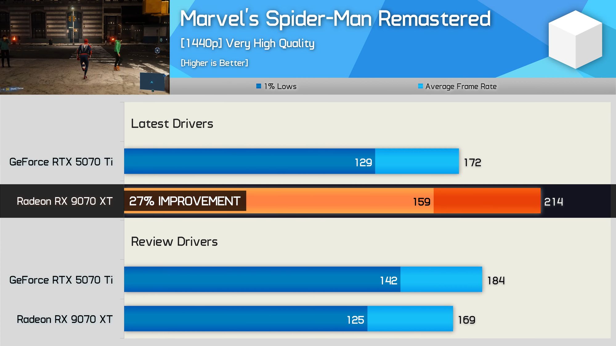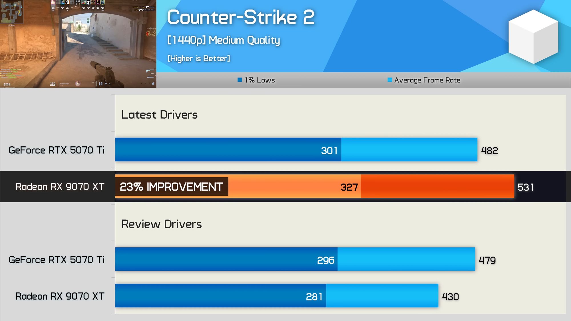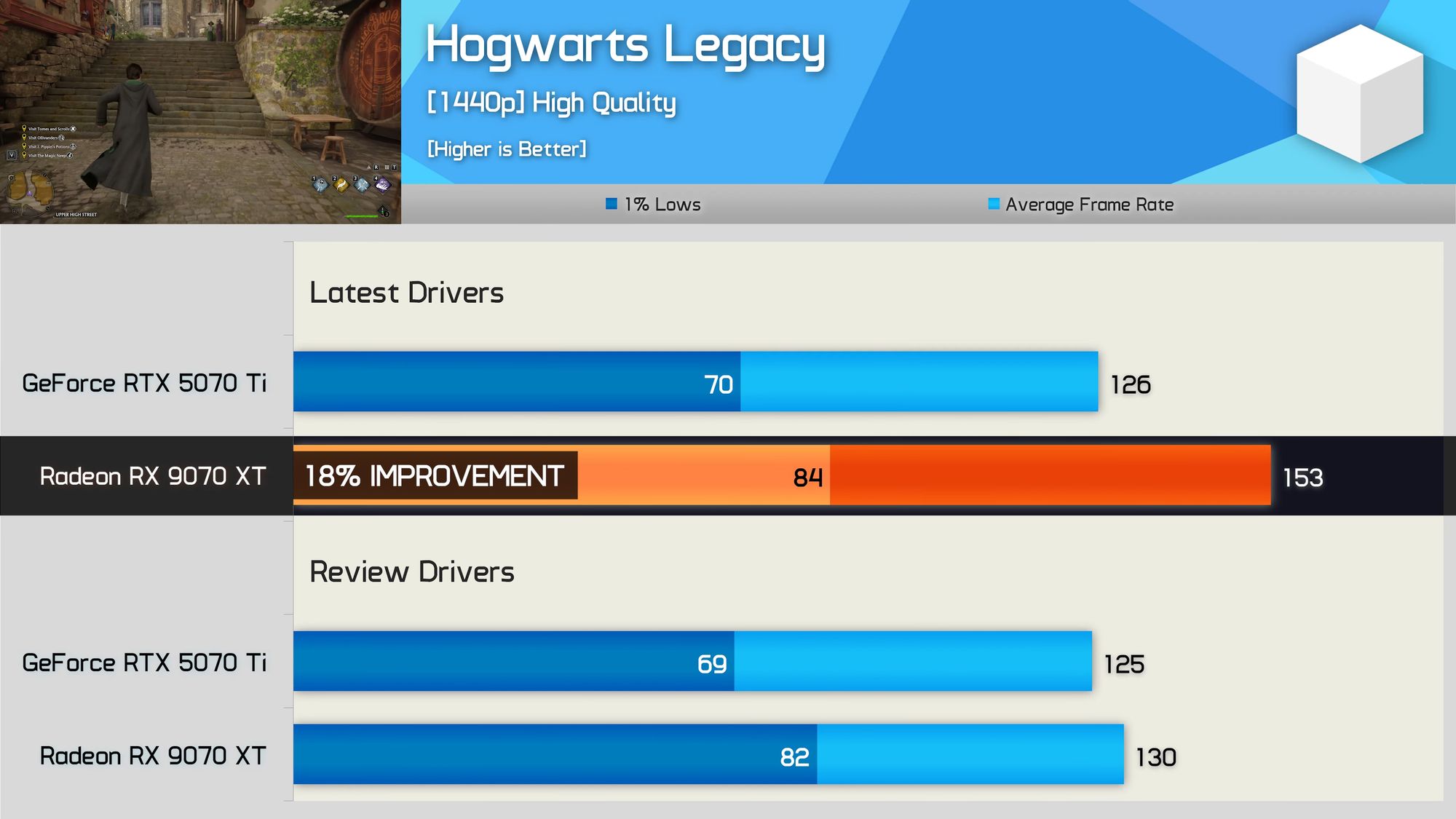 Hardware Unboxed tarafından yapılan testlerde, lansman günü sunulan sürücü ile güncel sürücü yüklü ekran kartları karşı karşıya getirilmiş. Performans anlamında tutarlılık sağlaması adına