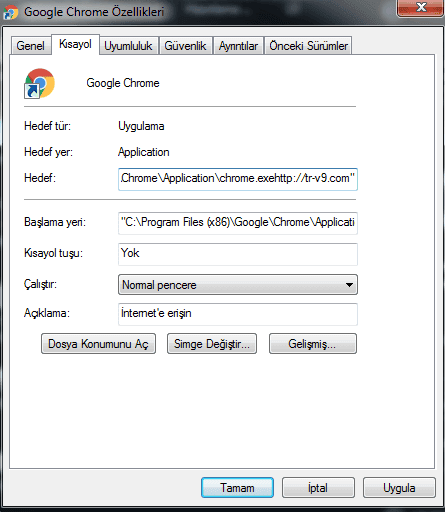 4-) Google Chrome veya Mozilla tarayıcınıza sağ tıklayın, özellikler deyin ve açılan pencerede aşağıdaki gibi bir internet sitesi uzantısı varsa silin. Silme işlemini chrome.exe'ye kadar yapmanız gerekmektedir.