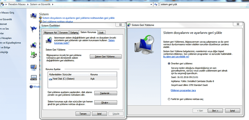 Eğer yukarıda belirtmiş olduğumuz işlemleri yapmanıza rağmen sorun devam ediyorsa Başlat > Denetim Masası > Sistem ve Güvenlik > Yedekleme ve Geri Yükleme sekmesine gelerek "geri yükleme noktası oluştur" deyip bilgisayarınızın bilginen en iyi zamanına geri yükleme yapmalısınız.