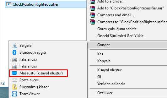 Burası ile işimiz bitti, klasörü kapatabilirsiniz. Şimdi sıra .exe dosyamızda. "ClockPositionRighteousifier.exe" dosyasını silinmeyeceğinden emin olduğunuz bir klasöre taşıyın. Ardından Sağ Tık -> Gönder -> Masaüstü (Kısayolu Oluştur) yolunu izleyerek Masaüstüne bir kısayol çıkartın.