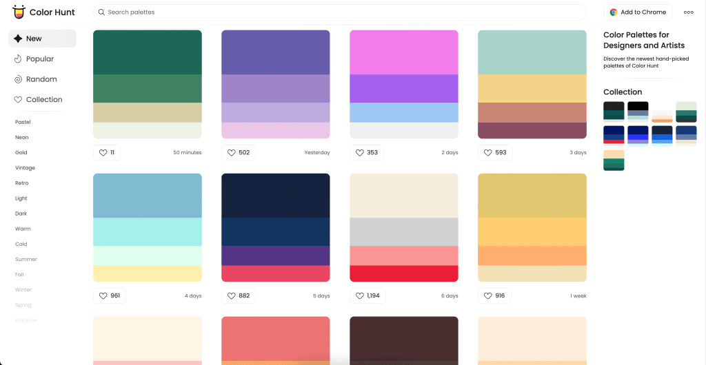 ColorHunt.co web sitesinde birçok renk paleti bulunuyor ve bu renk paletlerini çeşitli konulara ayrıştırabiliyorsunuz. Neon, Pastel, Koyu, Açık, Vintage gibi kategorilere uygun renk paletleri bulunurken sadece tek bir renkten oluşan renk paletleri bulmanızda mümkün.