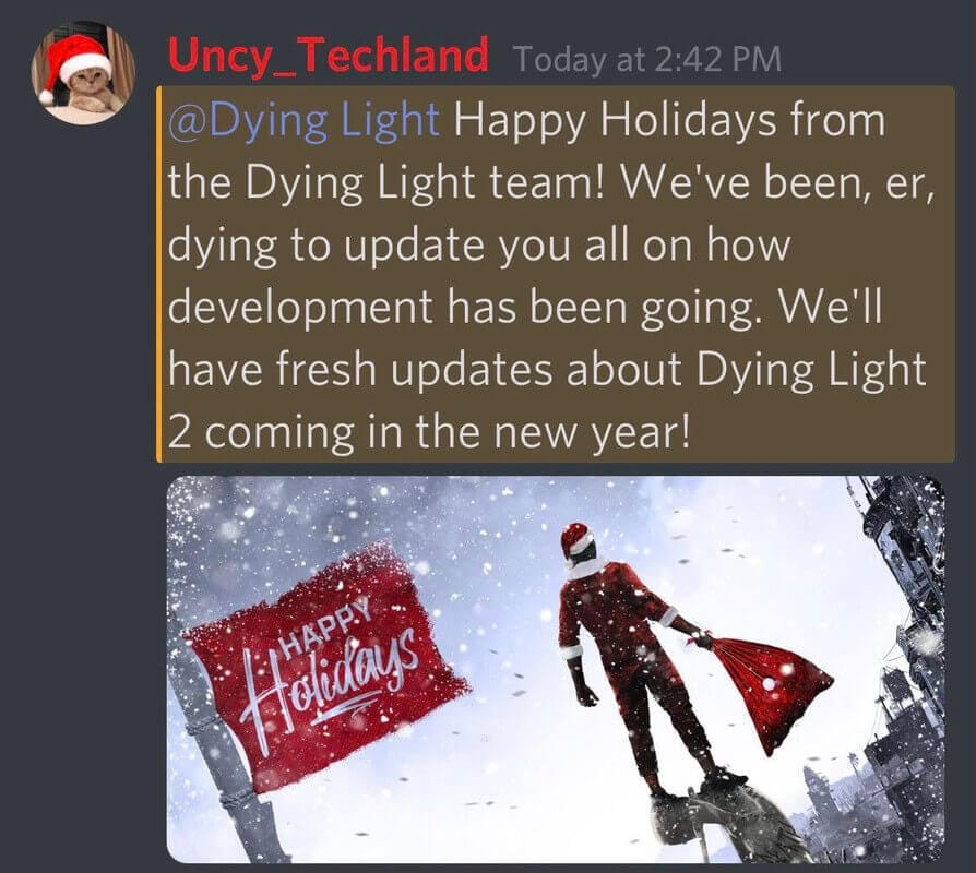 2020 yılının Mayıs ayında, Dying Light 2'nin baş oyun tasarımcısı olan Tymon Smektala, oyunun artık son geliştirme aşamasına girdiğini öne sürmüştü. Ancak, o zamandan bu yana oyun hakkında herhangi bir bilgi ya da görsel paylaşılmadı. Yine de Techland, 2021 yılında Dying Light 2 hakkında daha fazla bilgi paylaşacaklarını açıkladı.