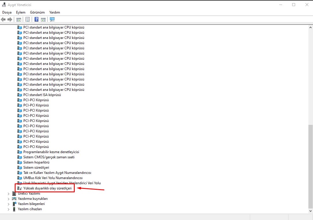 Aşağıda gördüğünüz gibi Yüksek duyarlıklı olay süreölçerine sağ tıklayarak devre dışı bırak diyoruz.