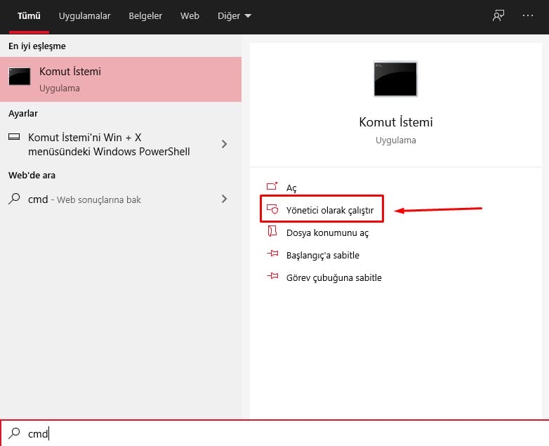 Ardından CMD komutunu yönetici olarak çalıştırıyoruz.
