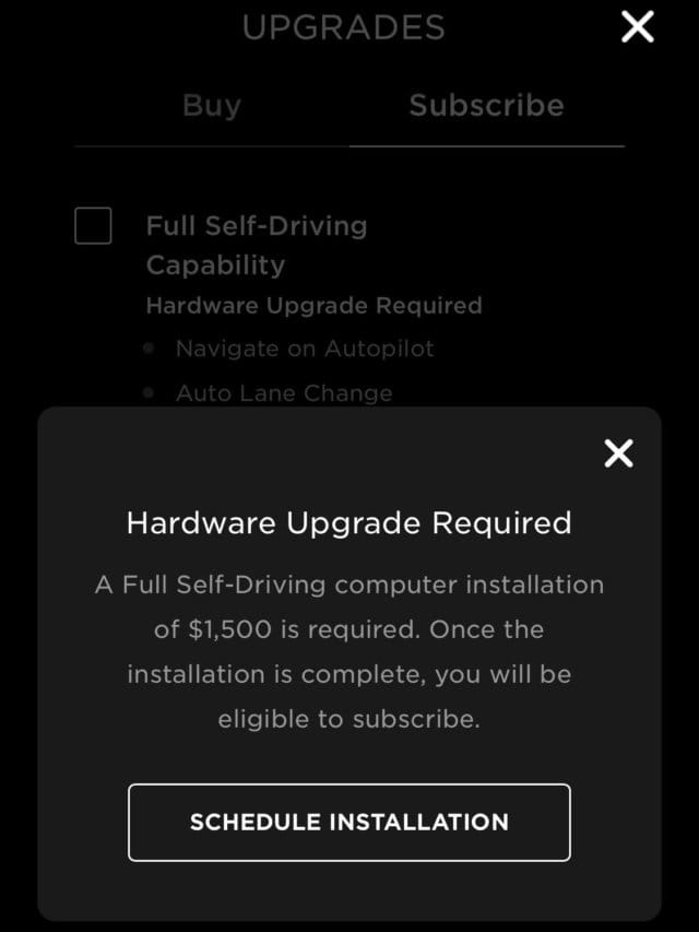 Bu daha önceden Tesla sahipleri için bir sorun değildi, çünkü önceki tek Tam Kendi Kendine Sürüş seçeneği bir kereye mahsus olarak satın alınıyordu ve fiyatı 10.000 Amerikan Dolarıydı ve buna gerekirse ücretsiz olarak "Donanım 3.0" yükseltmesi de dahil oluyordu. Bu, bir yazılım yükseltmesi dışında, araçlarının FSD'ye hazır olduğu vaat edilen sahiplerine, gereksinimleri karşılamak için birkaç bin dolar daha harcama ihtiyacı bırakıyor.