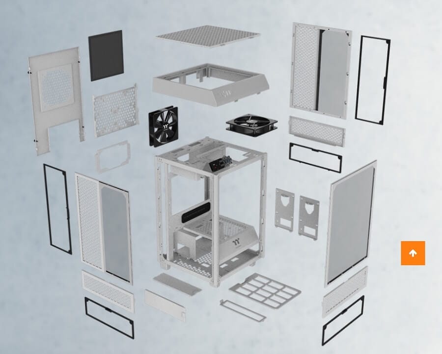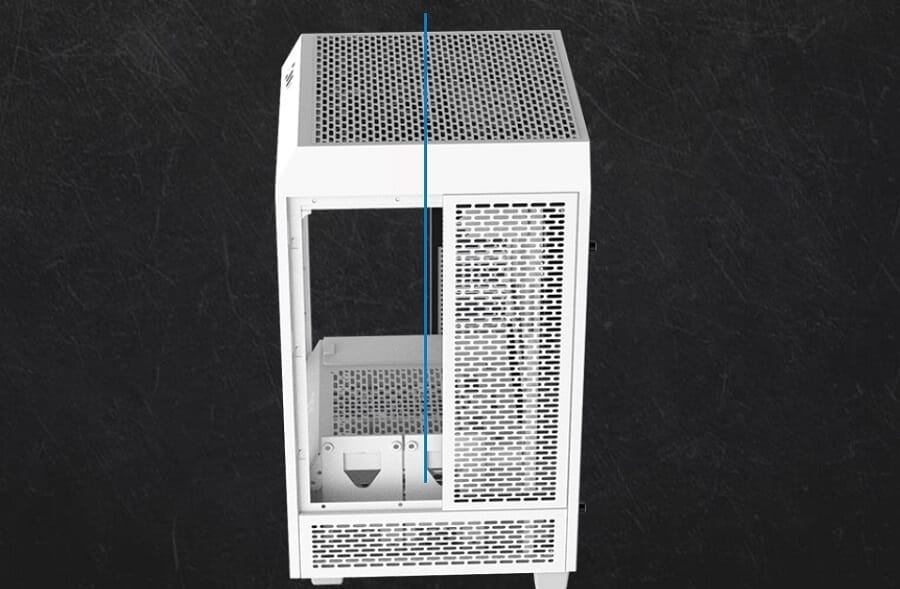 En tepeye çıktığımızda ise Thermaltake The Tower 100 Mini Chassis üzerinde yine delikli bir ızgara yapısının kullanıldığını görüyoruz. Burada en büyük artı yine modüler yapı artısı.